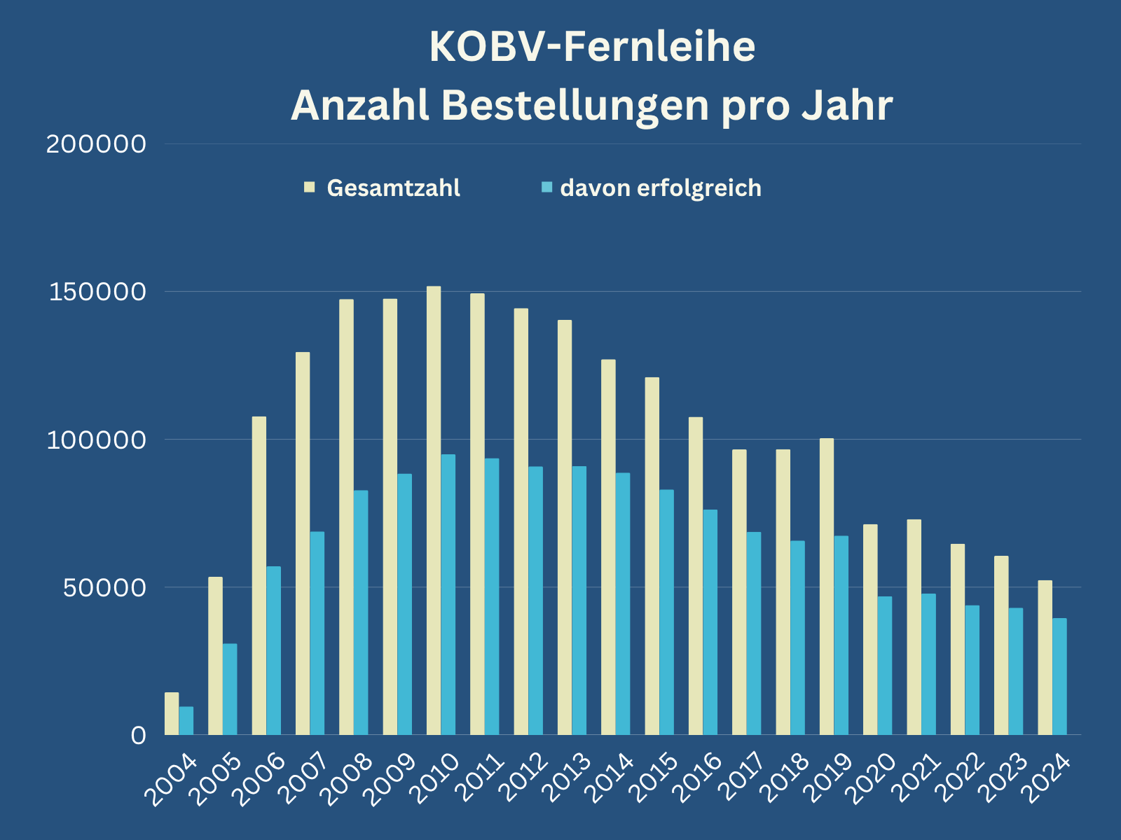 Übersicht zur Entwicklung der gesamten jährlichen Fernleihebestellungen im KOBV seit 2004.